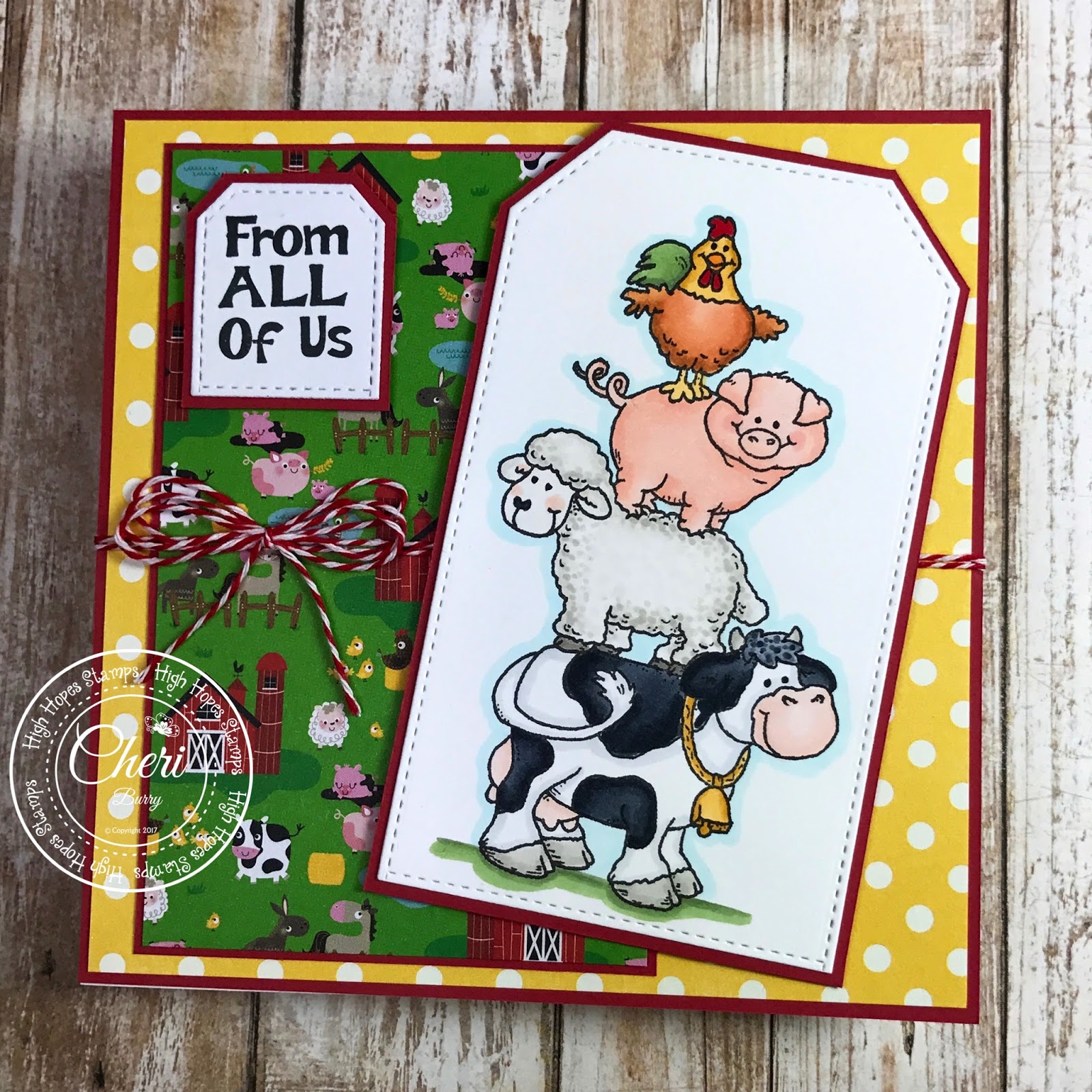 I absolutely adore this stamp from High Hopes! It's called "Funny Farm" and is the cutest little stack of Farm animals I have ever seen! I thought the sentiment "From All Of Us" matched this stamp quite perfectly!!